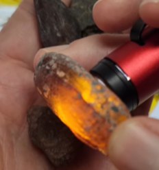 Raw amber looks like a rock, but it is translucent when you put a light up to it period regular rocks are not translucent. If you hit it with a flashlight, it is translucent. So this was mined out of the ground in Burma, and as you see, when you put a flashlight to it, it becomes very clear. So this clear thing with the flashlight, that’s obviously amber, but it looks like other rocks.