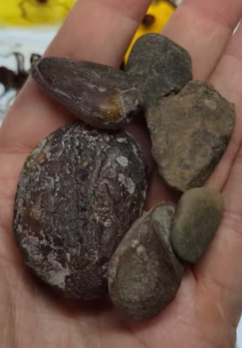 And here are some other rocks I picked up on the ground. This is a regular rock, and as you can see, it’s not translucent. And fake amber can come in small or big sizes, but this one’s amber. This one’s not because it’s not translucent. Not amber. Amber.