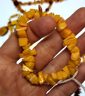 Now just to show a few basic things, look, here’s normal, real, natural amber, not pressed or nothing, right here, right? Those are little children’s teething necklaces. Here’s normal, not pressed, not heat-treated Baltic amber, and they’re half-polished, but they’re mixed colors, children’s necklaces, pretty nice. PHOTO of amber in above paragraph